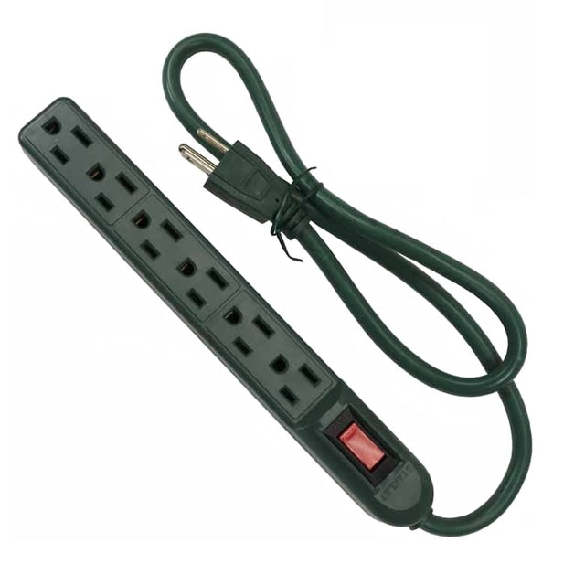 This Stanley All Purpose PowerMax 6-Outlet Power Strip has an easy on and off switch making turning on and off up to six different lighted Christmas decorations simple. It has a 2.5 foot extension cord attached to it for easy placement near a tree or table and has two keyhole slots in the back for mounting on walls, under cabinets, or on counter tops. Be sure to place it in a dry location, not to overload it and remember it is not a surge protector. Add determined watts for each plugged-in appliance or lamp (sum of watts on bulbs) to find total watts being used.