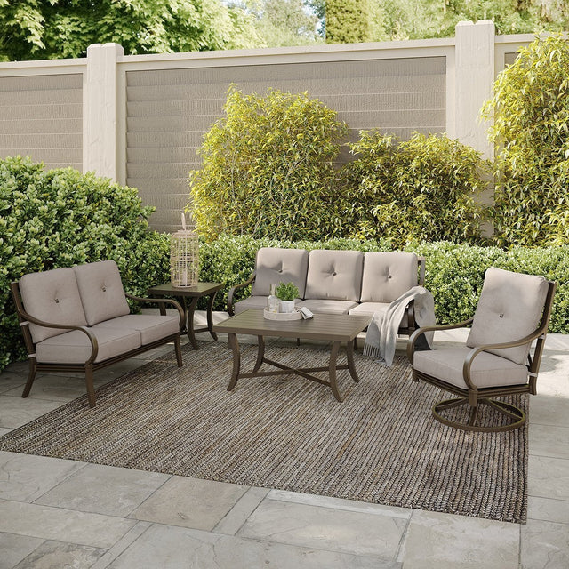 The Sorento Chat Collection boasts a captivating frame design with sweeping arms and a sunburst medallion, making it the perfect mix of style and utility.