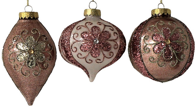 • One ornament is onion-shaped and decorated with rose gold and gold glitter