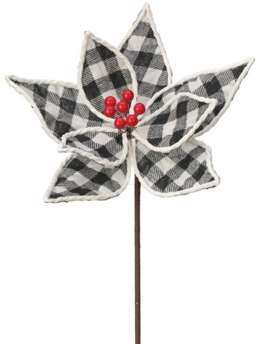 Celebrate the Christmas season by adding this Buffalo Check Poinsettia Stem to your holiday display! Featuring black and white buffalo check petals, along with red berries. This beautiful poinsettia and berry spray will give a country rustic look to your holiday decorations!