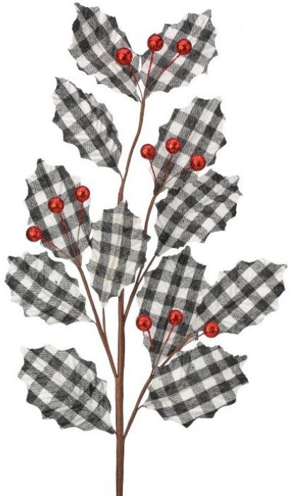 Celebrate the Christmas season by adding this Buffalo Check Holly Stem to your holiday display! Featuring black and white buffalo check petals, along with red berries. This beautiful holly leaf and berry spray will give a country rustic look to your holiday decorations!