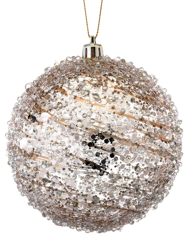 Bring icy texture to your holiday décor with this stunning Champagne Iced Ball Ornament. This ornament is encrusted with icy beads, so it catches and reflects the light in a unique and beautiful way. Perfect for adding a bit of shimmer and sparkle to your white and gold Christmas tree, the golden champagne swirls of this ornament will bring a festive feel to any room.