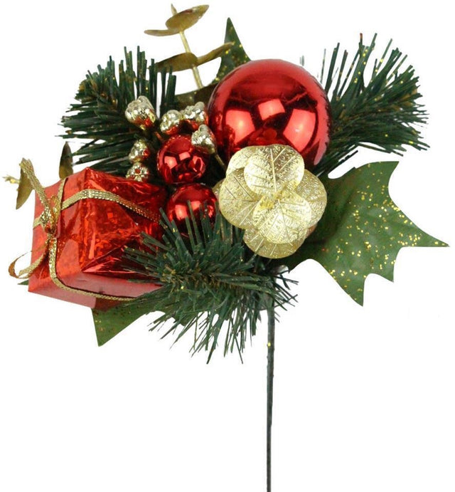 • Pick spray featuring faux pine needles, leaves, gold beads, red baubles and a big red and gold present