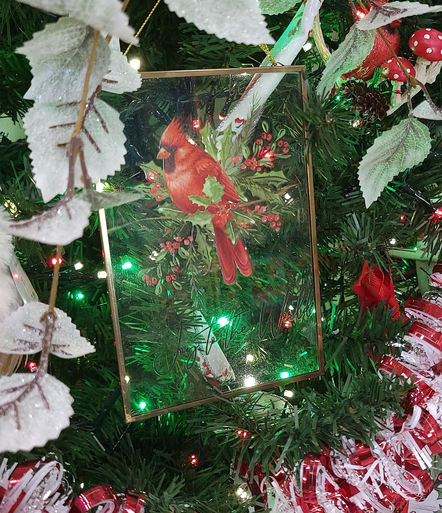 - One ornament reads "Merry Christmas" and features a cardinal in a wreath