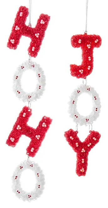 • One ornament reads "Joy"