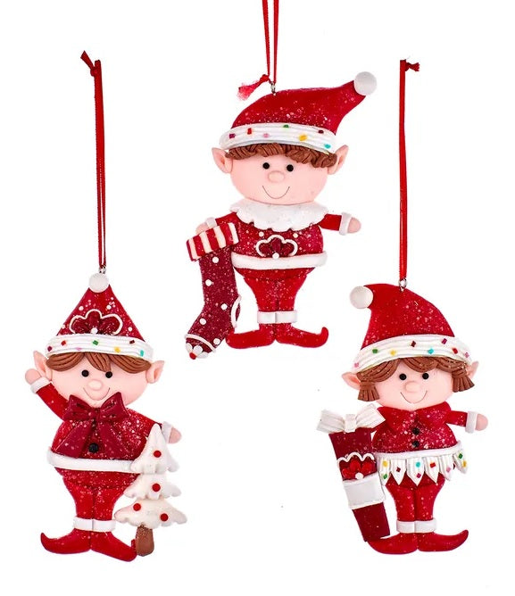 - Each elf is wearing a red and white glittered outfit with white icing-inspired details