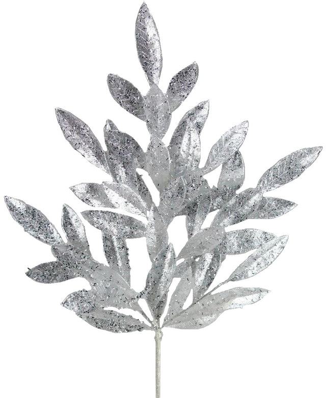 Bring some personality to any decorative display with the help of this Silver Bay Leaf Spray. This spray features clusters of shimmering silver leaves with black flecks, giving a high-end feel that allows this spray to fit with a number of decorative themes! Pair this spray with other glitter elements, or other floral enhancements, to let it stand out for all the right reasons.