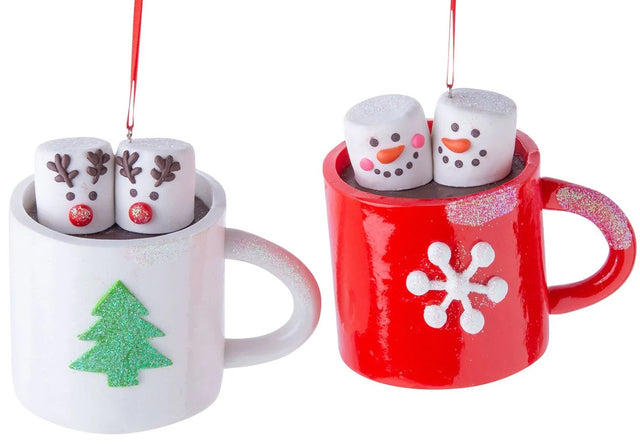 - One ornament is a red mug with a glitter snowflake detail and features marshmallows designed to look like snowmen
