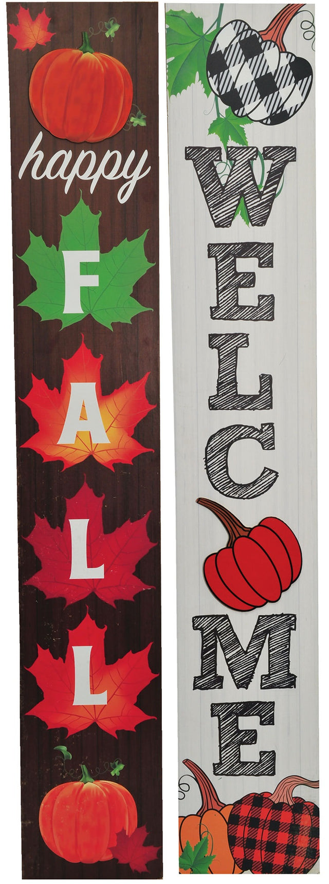 - One sign reads "Happy Fall" and features pumpkins and leaves on a dark brown background