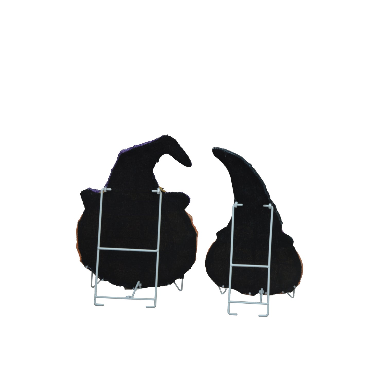 • One pumpkin is wearing a black witch hat with a yellow buckle