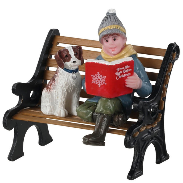 A Christmas Tale is a Lemax village Christmas figurine that features a young boy sitting on a park bench. The boy is reading 'Twas The Night Before Christmas to his young puppy, who's wearing a blue collar. Both are clearly enjoying this lovable Christmas story!