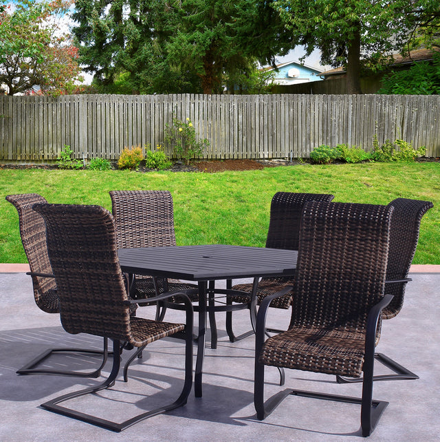 Enhance your outdoor dining experience with our Dublin Spring Patio Dining Set. Designed for top of the line luxury, this set features dining chairs with high backs and comfortable sling seating. The relaxing C-spring motion and soft fabric make these chairs ideal for porches, patios and sunrooms.