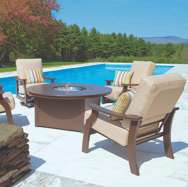 St. Catherine MPG Cushioned Seating & Chat Sets - (5 Pc. Loveseat/Fire Set) Chair, Swivel Rocker Chair, Loveseat, End Table, 36" x 54" Fire Pit is backordered and will ship as soon as it is back in stock.