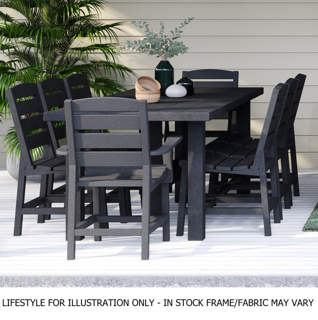 Rediscover al fresco dining with the Napa Dining Collection. This stylish and sustainable dining table, boasting clean lines and modern sophistication, seats up to 8 people and elevates your outdoor space. This table adds elegance and character to any casual living space, and is made from sustainable materials.