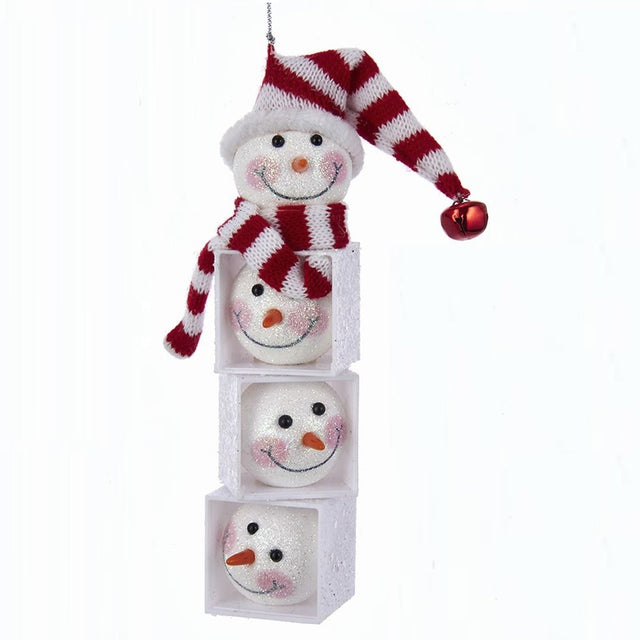 Celebrate the holidays with this Snowman Head Block Totem Ornament! It features three snowman head blocks with one snowman head wearing a Santa hat on top. The Santa hat is red and white striped with a red bell.