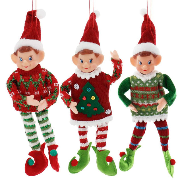 - Each elf is featured wearing decorated red, white and green sweaters and striped stockings