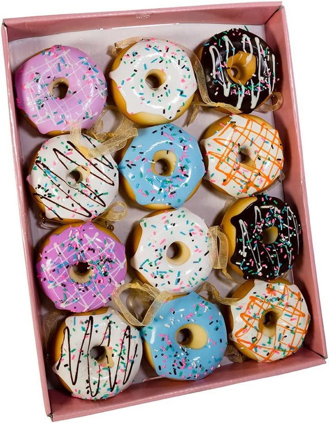 - Vibrantly-colored, realistic-looking donut hanging ornaments