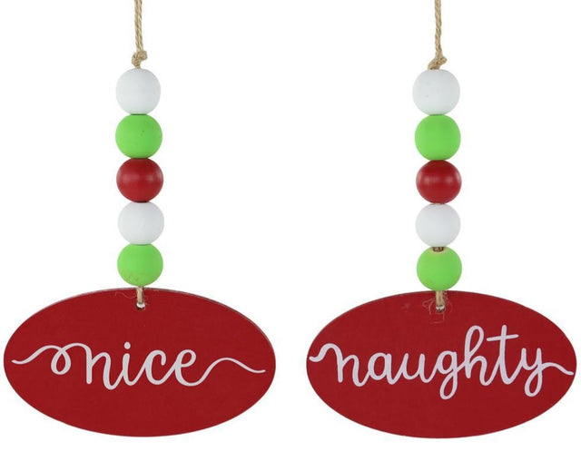 Enhance your Christmas tree and holiday decor with the help of one or both of these 2-Sided Beaded Naughty/Nice Ornaments! These ornament features painted wood beads, colored in red, lime green and white, along with an oval shape that reads "naughty" or "nice," depending on which side it is flipped!