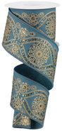 Featuring Mandala-like circles sitting within gold, swirling borders and glittered flowers, this smoke blue ribbon would be an incredible addition to your Christmas tree, centerpiece or gifts.