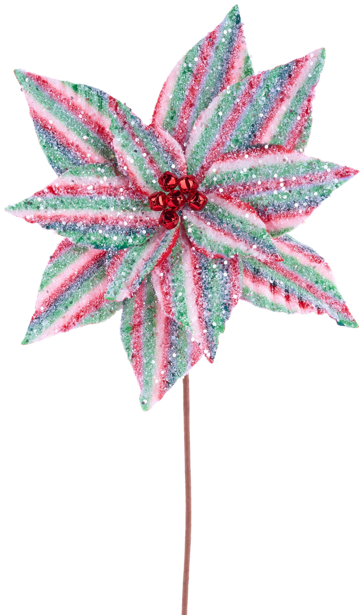 Transform your space into a winter wonderland with this Poinsettia Stem! Made with red, white and forest green frosted petals and red bell detailing, this eye-catching piece is perfect for adding a touch of festive flair to your tree or wreath.
