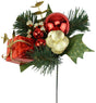 - Pick spray featuring faux pine needles, leaves, gold beads, red baubles and a big red and gold present